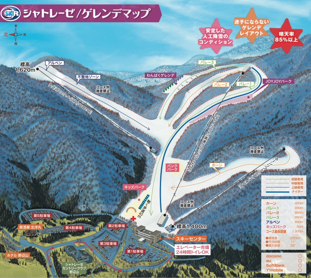 毎週土日の午後3時頃から可愛い動物のぬいぐるみから子供達にシャトレーゼのお菓子をプレゼント! スキーセンター内の2つのレストランでは子供から大人まで充実のメニューを取りそろえており、特に鉄板焼きステーキがオススメ! OPENから12/26までは初滑り料金・3/16〜クローズまでは春スキー料金でリフト券がお得!