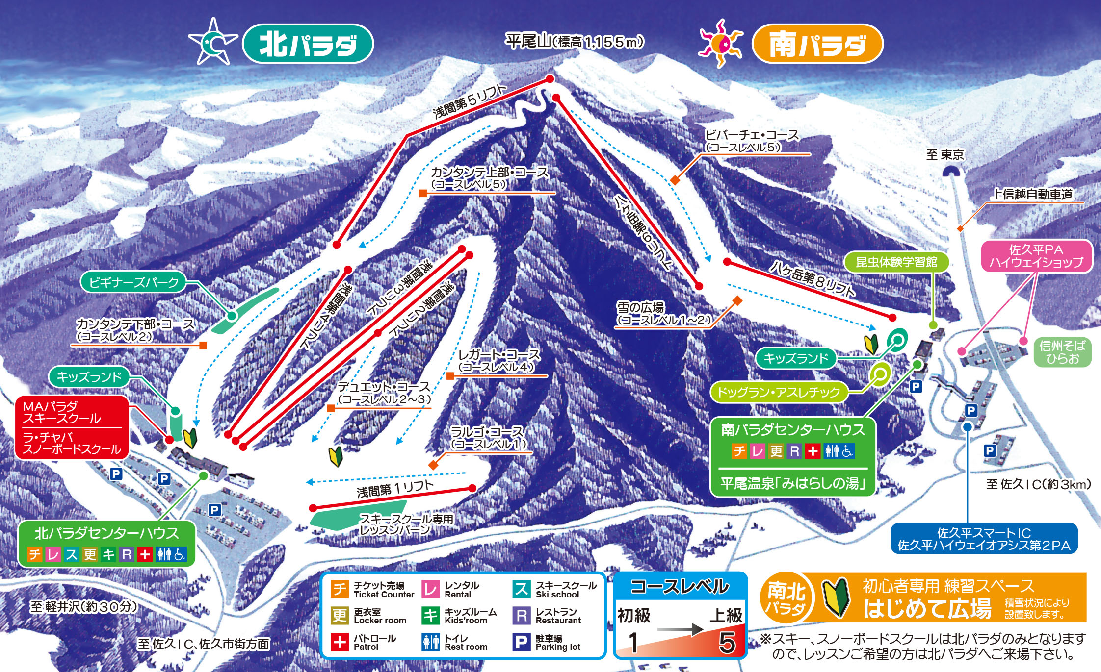 日本唯一、インター直結0kmのスキー場!首都圏から日帰りOKの抜群のアクセスと、晴天率90%の快適なゲレンデで、ファミリーに大人気!緩やかな斜面が多く、初めてのスキー・スノーボードデビューにもぴったりです。ムービングベルト付きの「初めて練習ゲレンデ」では安心して練習でき、キッズランドも屋外・屋内と充実。悪天候でも安心 ! 雪あそびからレッスンまで、家族みんなが笑顔になれるスキー場です。温泉やグルメスポットも隣接し、冬の一日を丸ごと楽しめるパラダへぜひお越しください!